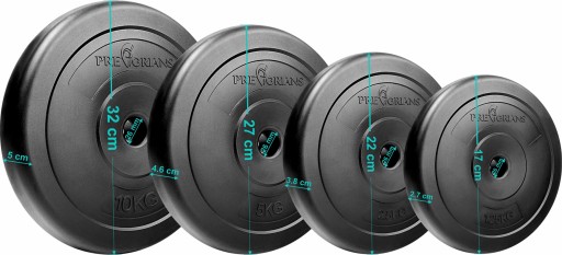 - 2 x 1.25kg - otwór na gryf 26mm, średnica krążka 17cm, grubość 2,7cm