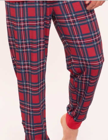 Spodnie z wzorem w kratkę granatowo-czerwoną.