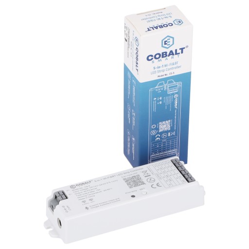 - Sterownik LED COBALT SMART CS-5 wykorzystujący system sterowania PWM (modulacja szerokości impulsu) służy do sterowania źródłami światła. Posiada wbudowaną bramkę WiFi,która umożliwia regulację oświetlenia za pomocą aplikacji mobilnej TUYA Smart Life oraz jest kompatybilny z pilotami radiowymi RF 2,4GHZ.