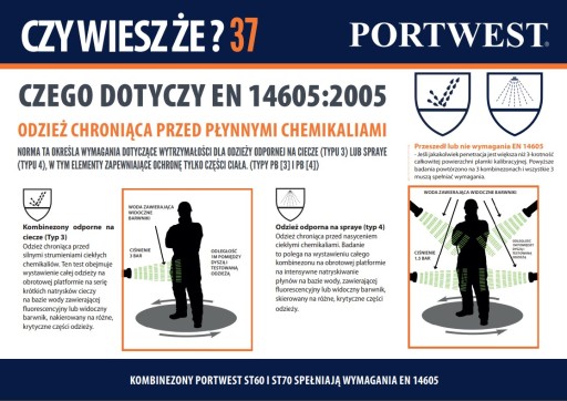 EN ISO 13982-1:2004+A1:2010 — ochrona przed działaniem stałych cząstek substancji chemicznych unoszących się w powietrzu, typ 5 - Odzież typu 5 jest przeznaczona do stosowania w sytuacji ryzyka narażenia na działanie produktów chemicznych zapewniając ochronę całego tułowia przed przenikaniem rozproszonych w powietrzu cząstek stałych.