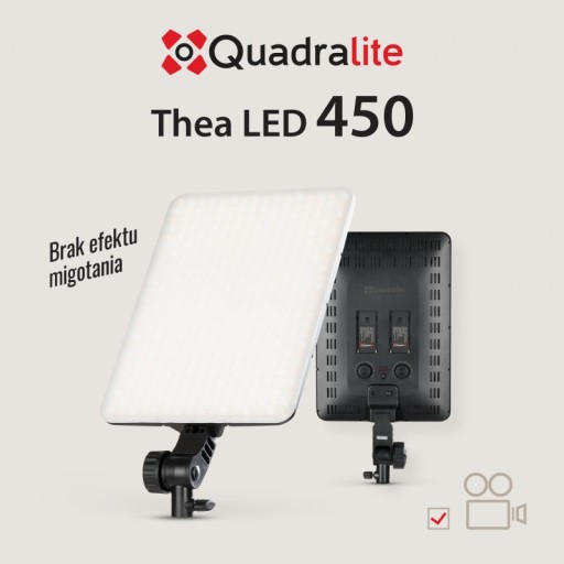 Zestaw bazuje na dwóch lampach ledowych Quadralite Thea 450 LED które są źródłem światła zaprojektowanym z myślą o oświetleniu większego obszaru. Ich kluczową cechą jest duża powierzchnia świecenia co w połączeniu z wysoką mocą panelu gwarantują doskonałe wypełnienie światłem sceny, dzięki czemu uzyskasz profesjonalny efekt na swoich nagraniach.