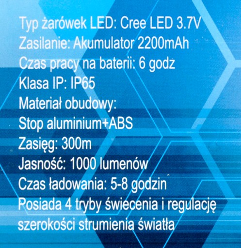 Do zasilania latarki został użyty 2x litowo-jonowy akumulator 2200 o pojemności 1200mAh, który pozwala nawet do 6 godziny pracy.