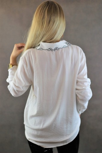 Klasyczny kołnierz zdobiony pięknym kwiatowym haftem w kontrastującym czarnym kolorze.