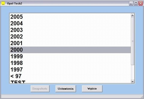 Wybierając opcję "Diagnostyka" pojawi się okno z wyborem rocznika auta, który chcemy diagnozować, następnie zostaniemy poproszeni o wybranie modelu oraz sterownika z którym chcemy się połączyć. Rysunki przedstawiają przykładowy wybór sterownika Air-Bag dla modelu Opel Astra G - 2000r.