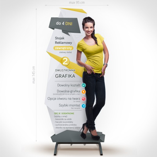- Grafika w formacie: TIFF, JPG, PSD lub PDF w CMYK; zalecana rozdzielczość w skali 1:1 zalecane to 100 dpi; wielkość grafiki mieszcząca się w maksymalnym formacie standu - może być mniejsza.