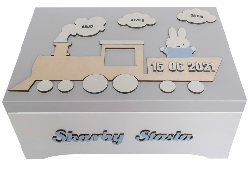 Na wieczku pudełka, które zostało pomalowane na jasno szary kolor znajduje się drewniany pociąg oraz metryczka z podstawowymi danymi dziecka, które umieszczone zostały na białych chmurach.