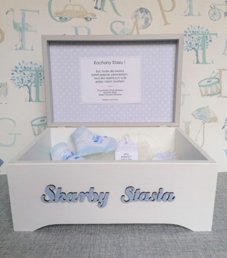 Ściany pudełka są w kolorze białym i widniej na nich napis Skarby Stasia. Oczywiście w tym miejscu wpiszemy skazane przez ciebie przy zamawianiu imię.
