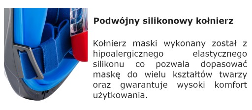 Silikonowy kołnierz - Kołnierz maski wykonany został z hipoalergicznego elastycznego silikonu co pozwala dopasować maskę do wielu kształtów twarzy oraz gwarantuje wysoki komfort użytkowania.