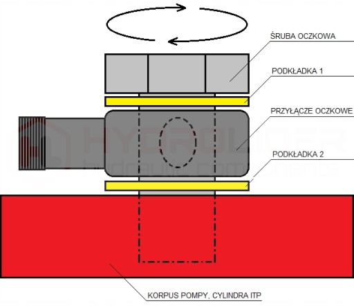 Podkładka znakomicie uszczelnia połączenia hydrauliczne, przykładowe zastosowanie przy podłączeniu przyłącza z korpusem oczkowym: