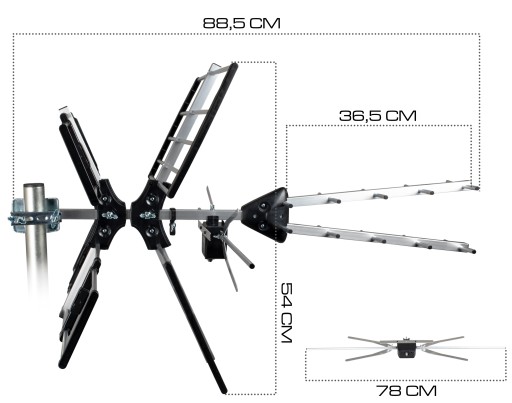 Trwałość i odporność anteny na wiatr zapewnia aluminiowa konstrukcja nośna. Kompaktowe rozmiary oraz specjalny uchwyt pozwalają na montaż anteny nie tylko na dachu, ale również na balkonach łub ścianach budynków (za pomocą stojaka).