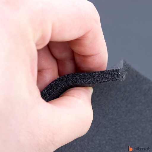 Pianka wyciszająca gumowa typu K6bk marki Bitmat o wysokim współczynniku tłumienia przeznaczona do stosowania w szerokim zakresie temperatur -50 stopni do 85 stopni C. Nie kurczy się i nie utlenia w przeciwieństwie do materiałów poliuretanowych.