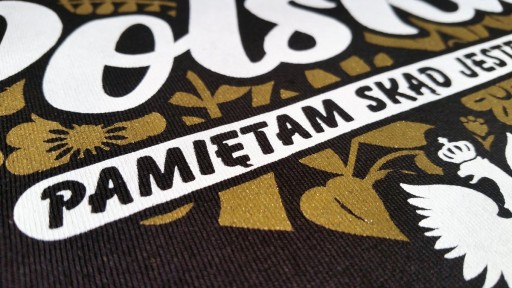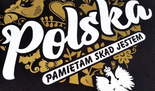 Nadruk z przodu wykonany jest dwoma kolorami farb, metodą sitodruku. Do jak najlepszego odwzorowania i intensywności bieli nałożone zostały 2 warstwy farby. Tło wzoru stanowi mix elementów, głównie symbolizujących nieodłączną dla polskiej tożsamości ludowość. Wykonane złotą-brokatową farbą, dającą efekt połysku, układają się w kształt serca, zauważalnie i modnie komponując się z kolorem materiału.
