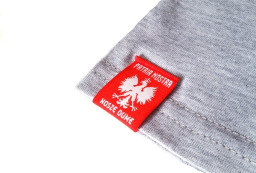 Subtelny przekaz oraz duma jaką wyraża herb Polski na piersi, nadają szczególnego charakteru prezentowanemu t-shirt-owi. Herb wykonany został jako aplikacja haftowana, ze starannością oddając kształt białego orła w koronie, na czerwonej tarczy, nadając mu przy tym szczególnego charakteru, na styl old school-owych technik zdobienia odzieży.