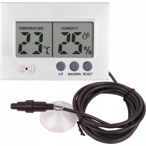Chcesz zadbać o perfekcyjny pomiar temperatury i wilgotności panujących w Twoim terrarium? Sięgnij po nasz wysokiej jakości, elektroniczny termometr z higrometrem. Dzięki niemu w szybki i bezproblemowy sposób dokonasz pomiaru temperatury w dwóch skalach °C i °F, a także dokonasz pomiaru wilgotności od 20% do 99%. Wyświetlacz LCD ułatwia odczyt wskazywanych wartości. Taśma umieszczona z tyłu obudowy urządzenia umożliwia jego zawieszenie. Dodatkową zaletą jest ergonomiczna przyssawka zaokienna ułatwiająca przymocowanie sondy obok termometru. Urządzenie zasilane baterią dołączoną do zestawu. Termometr i higrometr są niezwykle łatwe w obsłudze. Na obudowie znajdują się 3 przyciski: Przycisk C/F służący do zmiany jednostki wyświetlanej temperatury, Przycisk MIN/MAX służący do wyświetlenia minimalnej i maksymalnej zanotowanej temperatury, a także Przycisk reset służący do wyczyszczenia wszystkich dotychczas zanotowanych parametrów.