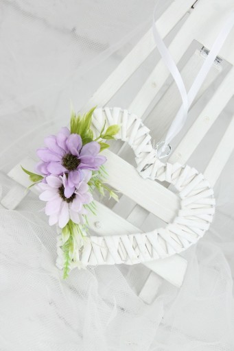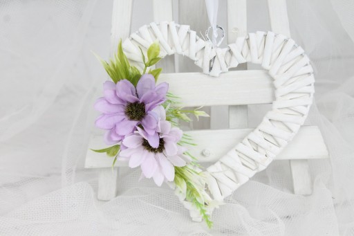 Serce wiklinowe białe o średnicy 15cm udekorowane kwiatami.