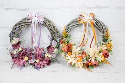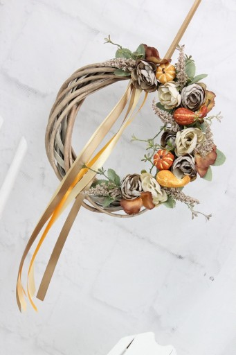 Jesienny wianek wiklinowy o średnicy 25cm udekorowany jesiennymi kwiatami.