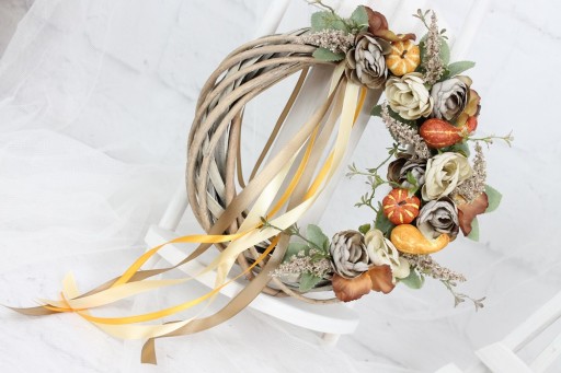 Dodatkowo ozdobiony dyniami, liśćmi, dekoracyjną trawą oraz tasiemką dopasowaną kolorystycznie.