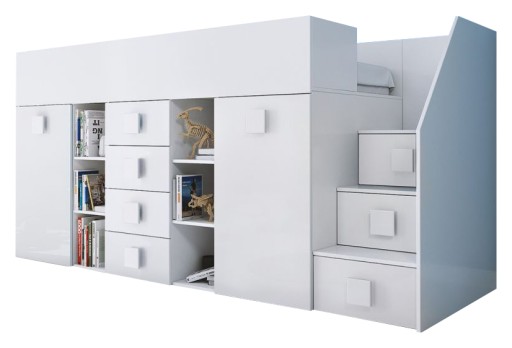 Łóżko antresola z biurkiem, szafą i komodą. Nowoczesna konstrukcja z płyty wiórowej laminowanej matowej oraz frontami z połyskiem, uzupełniona otworowanym stelażem z płyty będącym jednocześnie elementem konstrukcyjnym całej bryły.