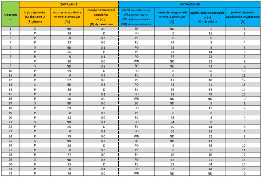 W sterowniku zaimplementowano 250 zdefiniowanych algorytmów działania. Sposób działania danego algorytmu opisany jest w tabeli w załączniku.