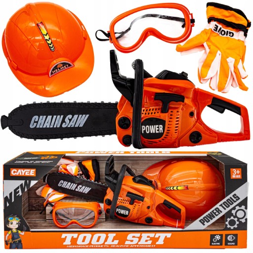 Praca z takim sprzętem wymaga dobrego zabezpieczenia głowy, rąk oraz oczu. Właśnie dlatego zestaw wyposażony został w kask, który amortyzuje wstrząsy i chroni głowę małego drwala. Aby wióry nie dostały się do oczu warto założyć okulary ochronne a rękawice zapobiegną obtarciom - w końcu praca z obróbką drewna nie należy do łatwych.