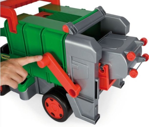 Gigant śmieciarka - model ze znanej serii dużych pojazdów Gigant Truck charakteryzującej się masywną konstrukcją i ogromną wytrzymałością. Śmieciarka wyposażona jest w kontener na śmieci, ruchomy podnośnik umożliwiający opróżnianie kontenera oraz otwieraną tylną klapę do ładowania dużych przedmiotów. Dziecko może bezpiecznie siadać na śmieciarce i odpychać się nogami, trzymając się specjalnie zaprojektowanego uchwytu z przodu pojazdu.