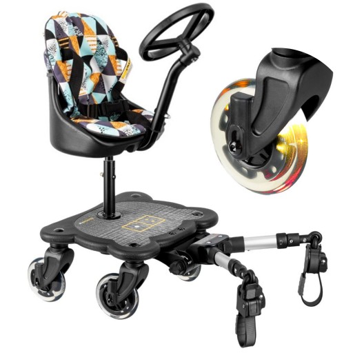 Obrotowa kierownica zapewni przyjemność z jazdy Twojemu dziecku, a świecące kauczukowe kółeczka sprawią, że dostawka będzie lepiej widoczna po zmroku.