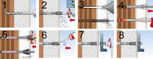 Zalecany montaż daszka szklanego tylko na tzw. kotwę chemiczną!!! Montaż daszka na kołki rozporowe jest niezgodny ze sztuką budowlną oraz aktualnym prawem budowlanym.