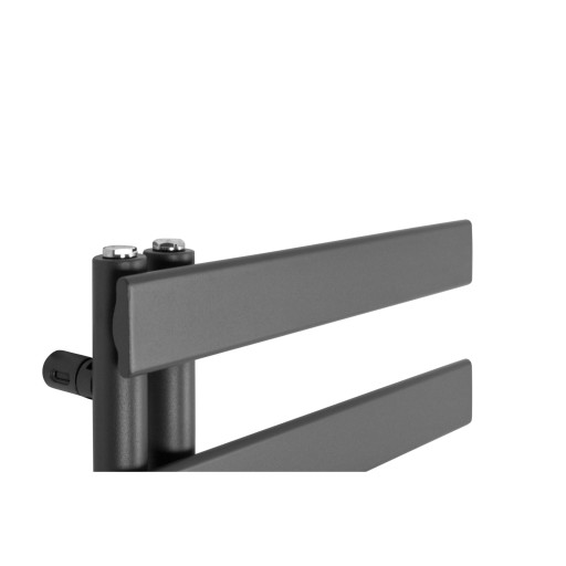 Nowoczesny grzejnik łazienkowy o zbudowany z prostokątnych listew. Asymetryczne usytuowanie pionowych kolektorów grzejnika nadaje mu dekoracyjnego charakteru, a jednocześnie pozwala na łatwiejsze przewieszanie ręczników. Grzejnik w kolorze grafit idealny do małej łazienki.