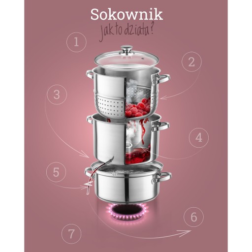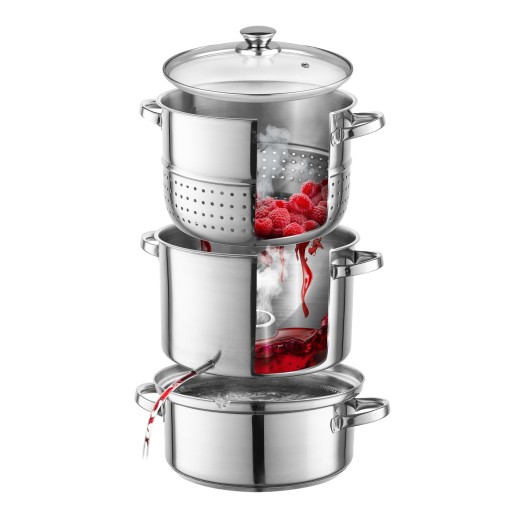 Sokowniki wykonane są ze stali nierdzewnej o bardzo dużej wytrzymałości (odporna na naprężenia i temperaturę). Przeznaczone są do wszystkich typów kuchenek. Możliwe jest też mycie ich w zmywarkach. Zestaw składa się z trzech nakładanych na siebie naczyń: