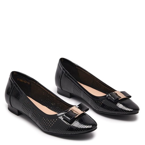 Balerinki damskie na płaskim obcasie wykonane ze skóry ekologicznej lakierowanej. Nosek migdałowy zdobiony kokardką. Ażurowa cholewka nadaje im stylu. Fantastycznie sprawdzą się na co dzień w ciepłe dni!