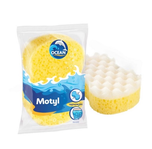Motyl - profilowana gąbka do kąpieli i masażu. Gąbka ze specjalnym wcięciem ułatwiającym trzymanie. Warstwa do masażu delikatnie stymuluje ciało. Gąbka posiada także drugą, miękką warstwę kąpielową. Przed pierwszym użyciem oraz po każdym kolejnym użyciu wypłucz dokładnie gąbkę. Pamiętaj, aby regularnie wymieniać gąbkę dla zachowania właściwej higieny.