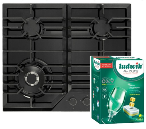 - Płyta gazowa Kernau KGH 6431 TCI B, wykonana ze szkła hartowanego w kolorze czarnym, szerokość 61 cm, 4 pola grzejne, moc całkowita 8800 W, sterowana pokrętłami z zapalarką automatyczną, żeliwnymi rusztami i zabezpieczeniem przeciwwypływowym gazu