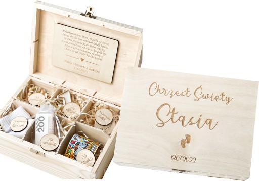 Drewniane pudełko wspomnień z przegródkami jako wyjątkowy prezent na chrzest, roczek lub inną okazję.