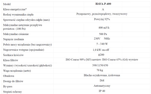 HAVA 400 P to energooszczędna centrala wentylacyjna stosowana do wymiany powietrza przy jednoczesnym odzysku ciepła.