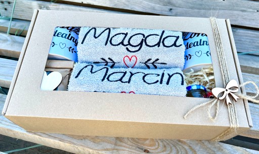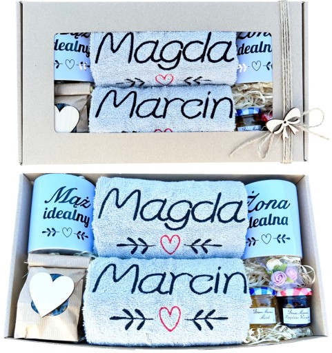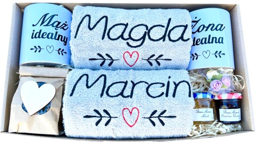 z grubej tektury z nadrukiem kwiatowego serca - pięknie się prezentuje i stanowi gotowy do wręczenia prezent. Po wyciągnięciu ręczników i kubków może posłużyć, jako doskonałe miejsce na pamiątki ze ślubu lub rocznicy ślubu.