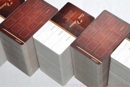 Sztywny karton o gramaturze 300g (nie kreda). Karton jest sztywniejszy od kredy i trwalszy. Dodatkowo przednia część jest laminowana błyszcząco na całej powierzchni. Papier z którego są wykonane karty dzięki swojej strukturze jest o wiele sztywniejszy np. od papieru kredowego o tej samej gramaturze.