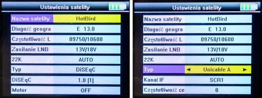 - Wybór satelity wraz z częstotliwością (transponder satelitarny) z ustawieniami portu DiSEqC. Obsługa konwerterów Unicable I z możliwością wprowadzenia do 8 parametrów SCR oraz Unicable II z możliwością wprowadzenia do 32 parametrów SCR
