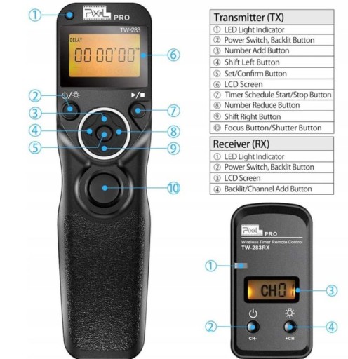TW-283 obsługuje automatyczne ustawianie ostrości, fotografowanie pojedyncze, fotografowanie ciągłe, fotografowanie BULB, fotografowanie z opóźnieniem i fotografowanie z harmonogramem czasowym. Ustawienie opóźnienia fotografowania może ustawić czas opóźnienia i liczbę zdjęć: czas opóźnienia zmienia się od 1 s do 59 s, a liczba zdjęć zmienia się od 1 do 99.