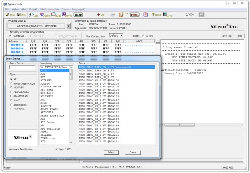 XGecu T48 - To uniwersalny, bardzo szybki mikroprocesorowy programator mikrokontrolerów, pamięci EPROM, EEPROM i Flash (zarówno typu NOR jak i NAND) oraz matryc logicznych PAL/GAL. Dodatkowo programator pozwala na testowanie pamięci SRAM i układów logicznych TTL/CMOS.