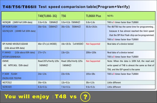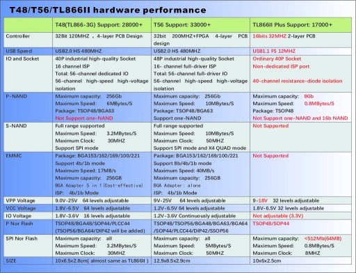 - Obsługa szeregowych pamięci NOR: max. pojemność: wszystkie / max. prędkość: 3,2 MBytes/S / max. taktowanie: 30MHz (TL866II Plus: max. pojemność: <512Mb (64MB) / max. prędkość: 0,8 MBytes/S / max. taktowanie: 8MHz / T56: max. pojemność: wszystkie / max. prędkość: 5 MBytes/S / max. taktowanie: 50MHz )