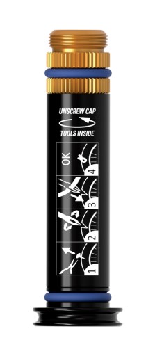 Zestaw jest łatwo dostępny w celu szybkiej naprawy opony i zawiera pięć wysokiej jakości wkładów do opon bezdętkowych, które można również przechowywać w jego korpusie. Zestaw służy również jako zatyczka do kierownicy i jest dostarczany z trzema różnymi rozmiarami uszczelek typu O-ring, aby zapewnić bezpieczne dopasowanie w większości otworów kierownicy.