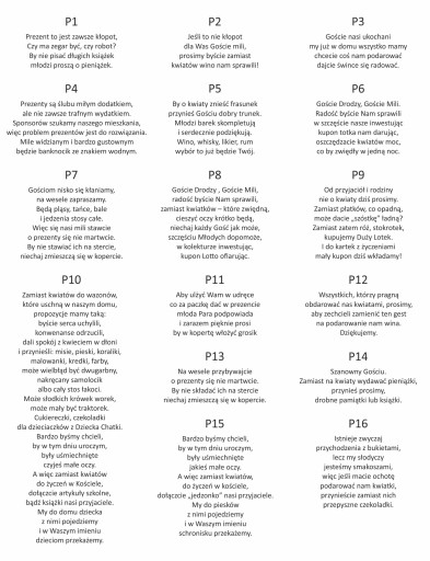 - Wybierz spośród naszych szablonów: wzór zaproszenia (Z), treść (T), czcionkę (F), cytat (C) oraz tekst o prezentach (P).