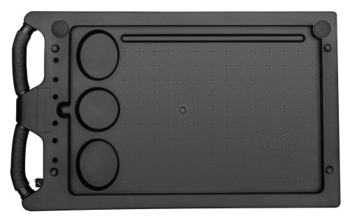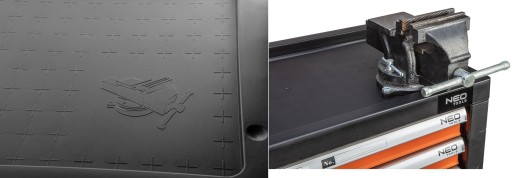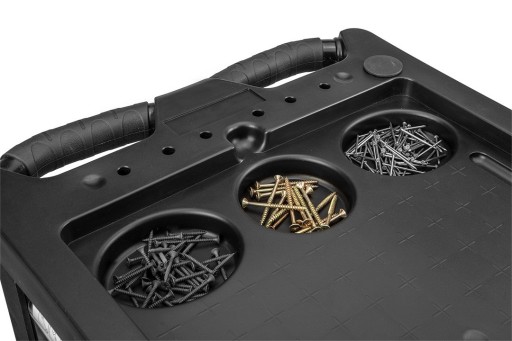 Kompozytowy blat szafki posiada boczny, gumowy uchwyt dla wygodniejszego transportu oraz dedykowane miejsce na imadło dla prostszego montażu. Boczne, perforowane ścianki można zagospodarować jako miejsca na dodatkowe akcesoria oraz haki.