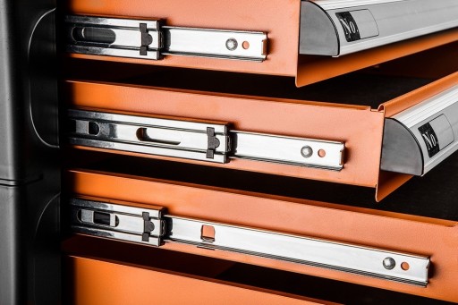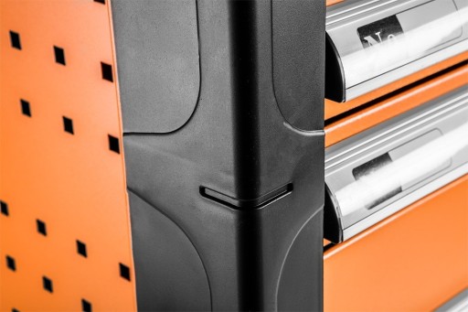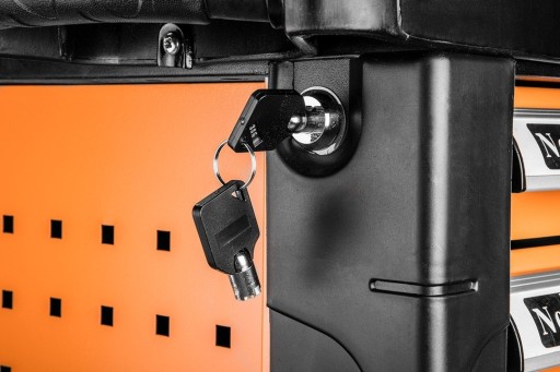 Niezwykle użyteczna i wygodna w korzystaniu szafka warsztatowa, zawierająca sześć indywidualnych szuflad wysuwanych na prowadnicach kulkowych. Do stalowego, stabilnego korpusu zostały przymocowane koła z trwałego PVC, przystosowanego do udźwigu 200 kg. W 100% otwieralne szuflady posiadają opcję blokady oraz zostały wyłożone praktyczną wkładką piankową PVA. Zamykają się na centralny zamek, oszczędzając czas oraz gwarantując bezpieczeństwo.