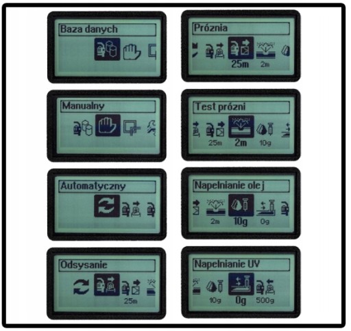 Tryb manualny- umożliwia wprowadzenie wszystkich parametrów takich jak czas próżni, ilość oleju oraz ilość gazu ręcznie, dzięki temu trybowi każdy etap możemy wykonać osobno.