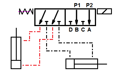Suwak dwupozycyjny (1 - 2), na sprężynie, czyli sam wraca do pozycji neutralnej po odcięciu dopływu prądu. Podczas gdy suwak jest w pozycji neutralnej (1), możliwe jest sterowanie siłownikiem nr 1.