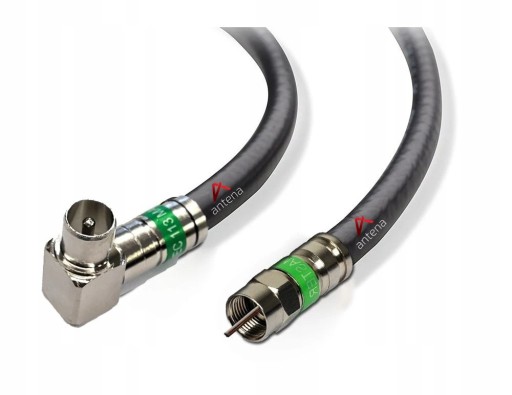 Gotowy zewnętrzny kabel antenowy wyposażony w zaprasowane maszynowo złącze kompresyjne typu F (z gwintem) a zdrugiej strony Kątowy Wtyk IEC (męski, do telewizora lub dekodera) zaprasowany kompresyjnie.