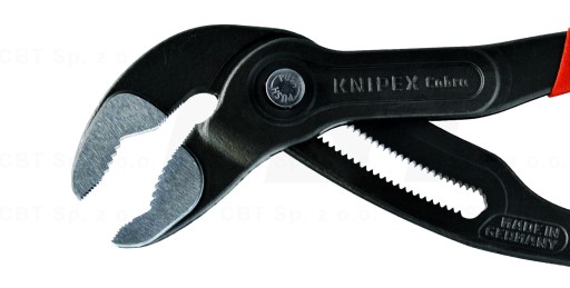 KNIPEX Cobra® - szczypce do rur nowej generacji. Nigdy więcej czasochłonnego dopasowywania rozwarcia szczęk do odpowiedniego rozmiaru. Wystarczy tylko umieścić górną szczękę na chwytanym przedmiocie, nacisnąć przycisk i przyciągnąć dolną szczękę. To takie proste!