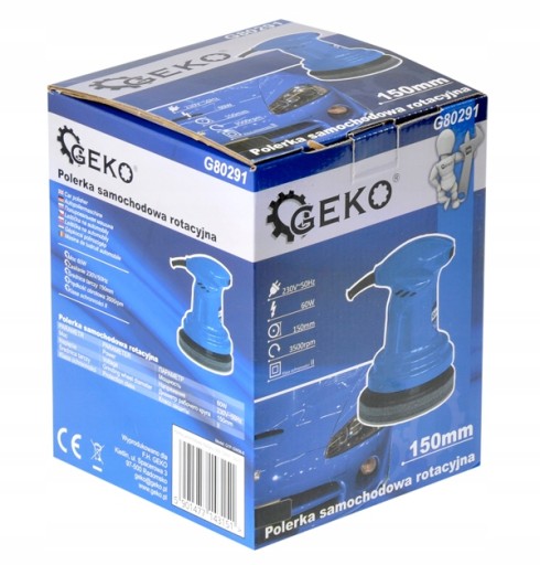 Wysokiej jakości rotacyjna polerka samochodowa 150mm firmy GEKO wyposażona w silnik elektryczny o mocy 60W.