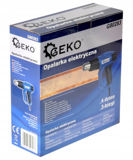 Wysokiej jakości opalarka elektryczna firmy GEKO wyposażona w silnik elektryczny o mocy 2000W umożliwiający wytworzenie temperatury na poziomie 550ºC.